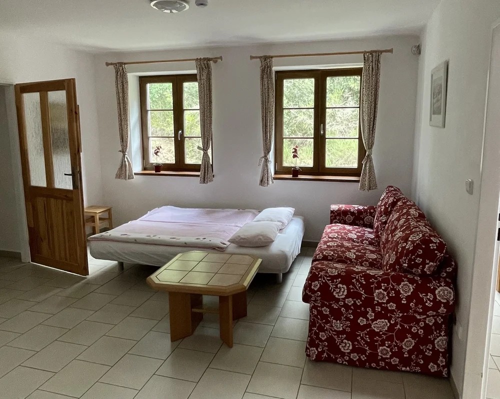 Náš největší apartmán se 2 ložnicemi, obývacím pokojem s rozkládací sedačkou a vybavenou kuchyní. Velká koupelna se sprchovým koutem i vanou.